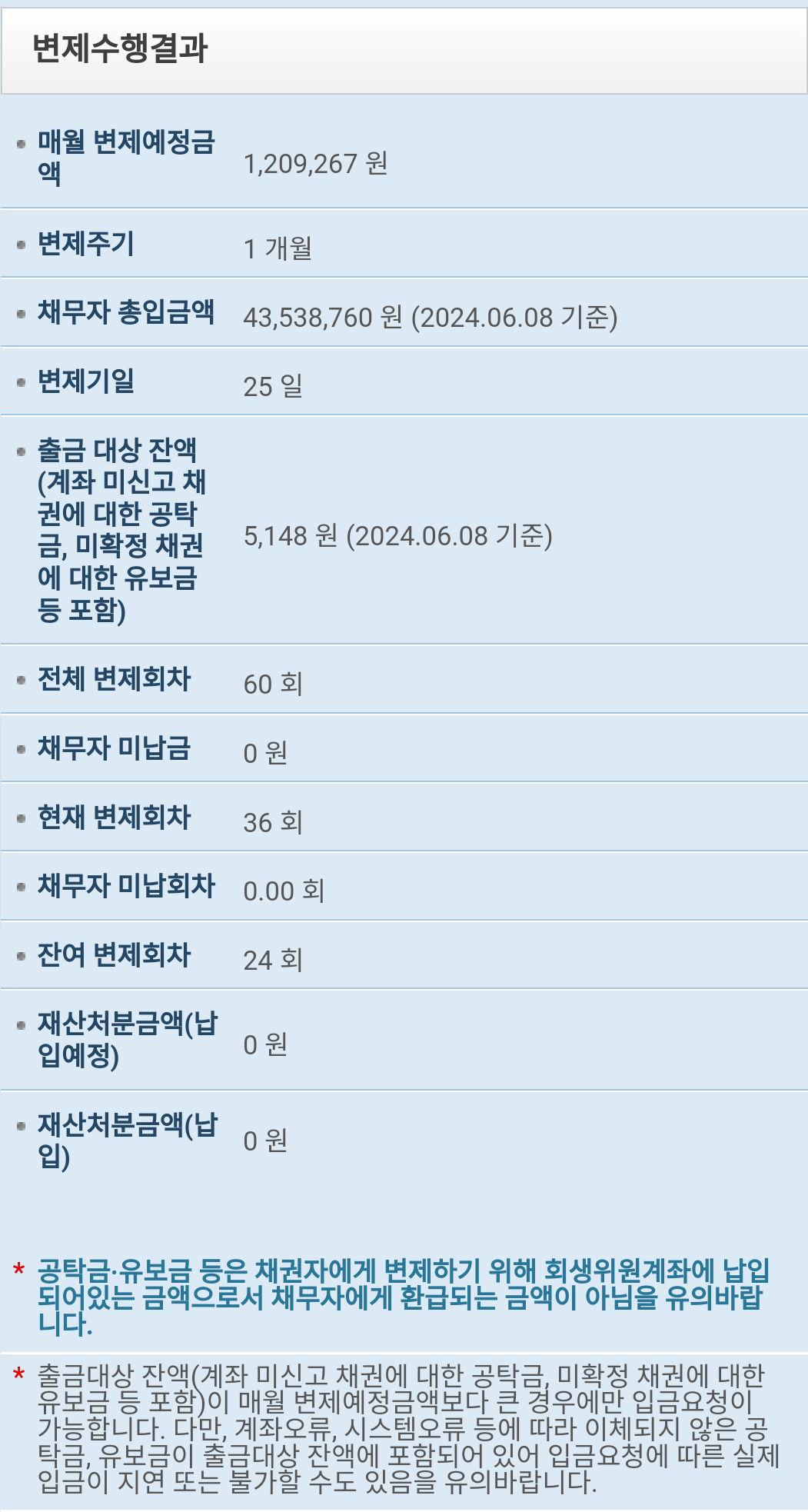 지난 달 5월 25일 변제금 입금으로 5년의 변제 중 정확하게 3년의 변제를 마쳤습니다. 60개월 진짜 길긴 기네요. 이 지겨움을 몸소 겪어 보니 물건 구매시 60개월 할부 구매 같은건 이용하지 않을 것 같습니다. 한편으로는 변제기간이 3년이었다면 마지막 입금이 되었겠다 & 3년이면 회생도 할만하다ㅋ 싶은 생각도 들었습니다. but 저는 아직도 2년을 더 갚아야 하니 3년 변제인 분들이 정말 너무너무 부럽게만 느껴지긴 합니다. 그래도 이 나름의 기쁜 소식을 전하며 지난 3년간 제가 얼마만큼의 금액을 갚았는지 의정부지법 회생위원 계좌로 보낸 변제금 내역을 폰에서 캡쳐해서 공개하겠습니다.